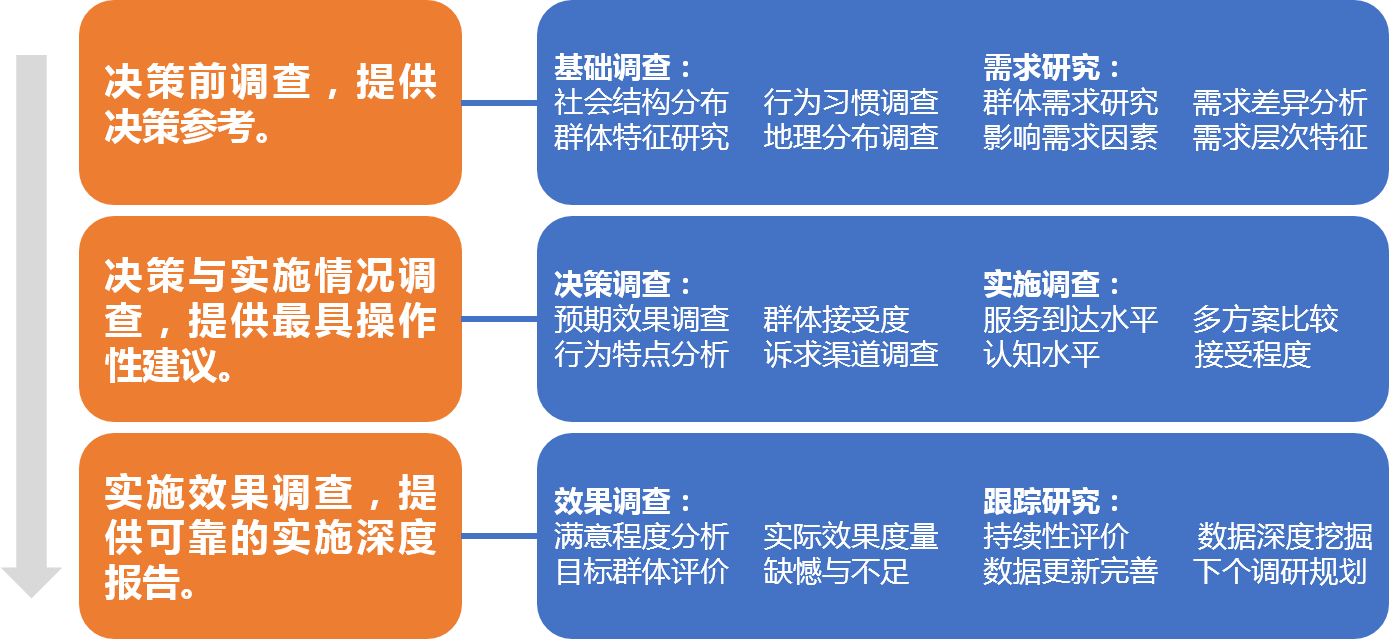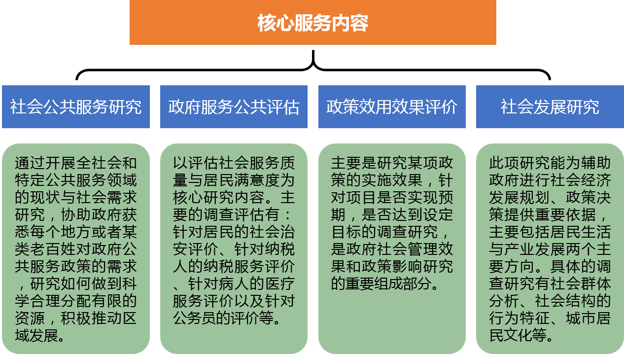 目前我國各級政府在追求發展效率的同時,也在積極推動和創建和諧社會,如何掌握社會需求,提供合理服務,降低社會公共事務成本,取得工作好評對于決策和執行層都非常重要。另外如何科學、合理、客觀地由社會對工作做出真實評估,對于總結特點、發揚優勢、彌補不足更為重要。華夏經緯在政府/協會等領域擁有豐富的資料、最新的政府統計信息及相關研究經驗,并受到了各級政府和職能部門的充分肯定。