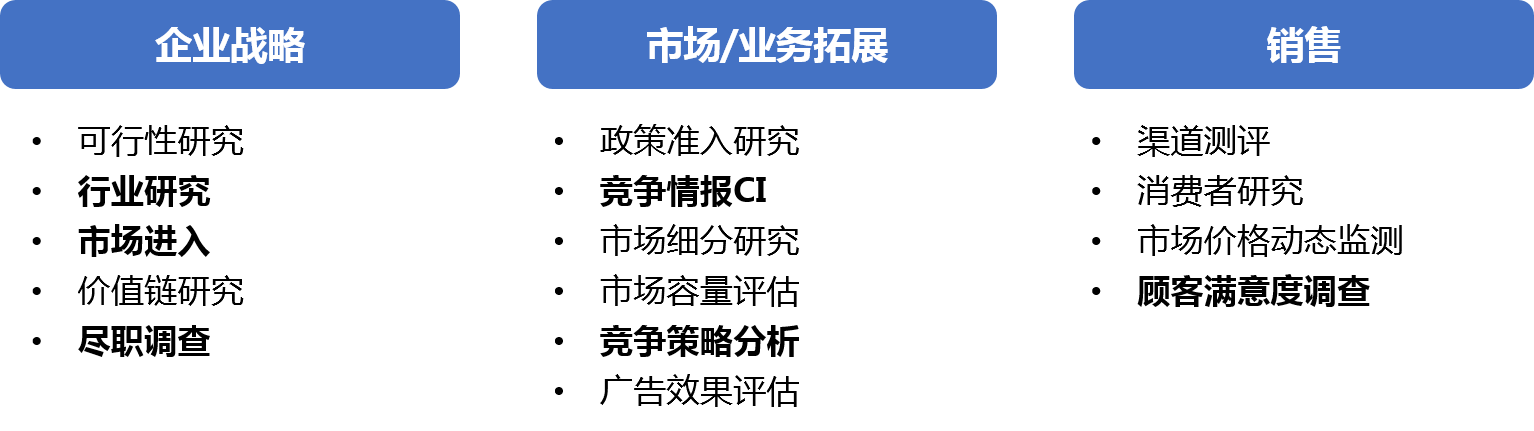 憑借覆蓋全國的監測網絡和數據、調研、咨詢立體服務板塊,華夏經緯擁有覆蓋160多個細分行業的研究經驗,為您提供對整體市場以及細分市場的行業咨詢與洞察。我們擁有廣泛的行業專家網絡以及專注于各個行業的資深研究專家,能夠站在企業業務的角度,為企業提供對生意模式有影響力的解決方案。